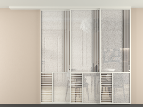 Во всех алюминиевых перегородках, независимо от типа установки, используется компланарный раздвижной механизм, благодаря которому декоративная крышка и полотно находятся в одной плоскости.