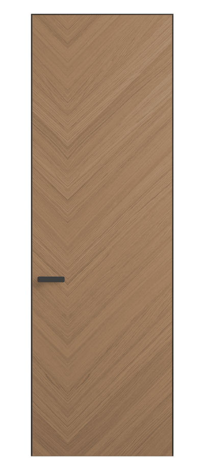 Полотно Рифт в скрытом алюминиевом коробе становится полноценным элементом декора. В коллекции представлено 9 моделей дверей в высоте до 3 метров. Рисунок раскладки шпона варьируется от простого до сложного. «Рубашка» для каждого полотна подбирается вручную по цвету, текстуре и фактуре.